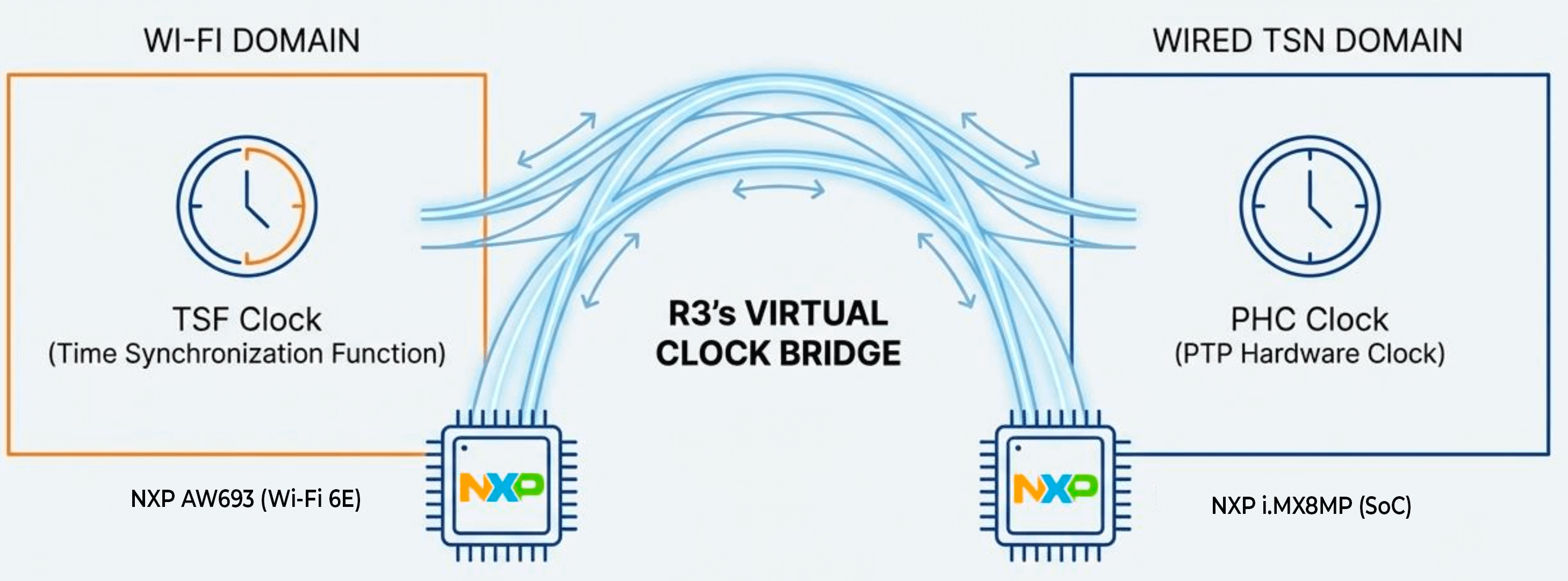 In a joint effort, NXP and R3 Solutions have developed a TSN-capable Wi-Fi system based on NXP’s standard AW693 Wi-Fi chipset. This enables Wi-Fi segments to be seamlessly integrated into wired TSN networks, using the same TAPRIO (Time-Aware Priority) shaper across both media. In particular, a novel hardware-assisted cross-synchronization mechanism has been developed that establishes a high-fidelity link between the Wi-Fi TSF and the Ethernet PHC, effectively extending gPTP across the wireless segment.